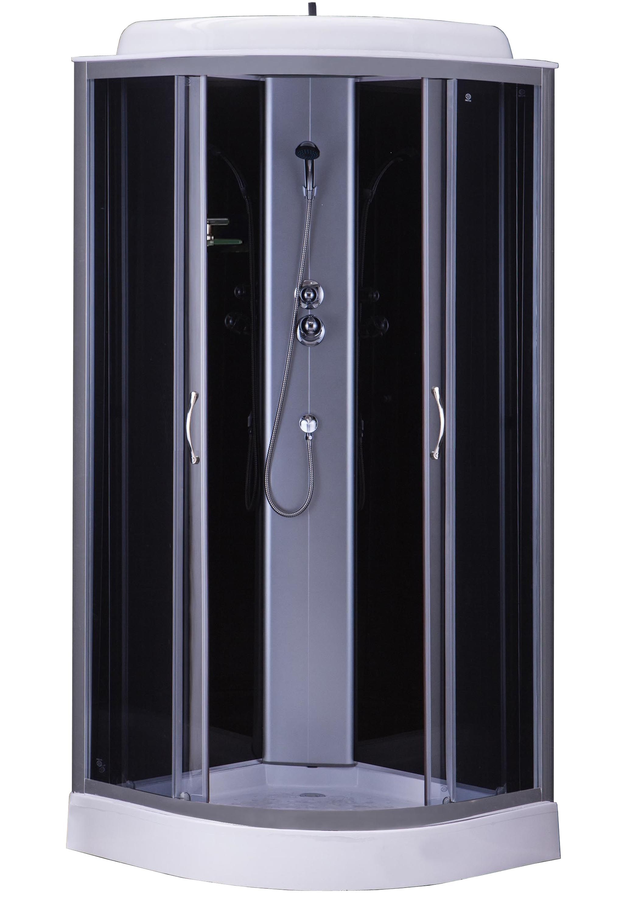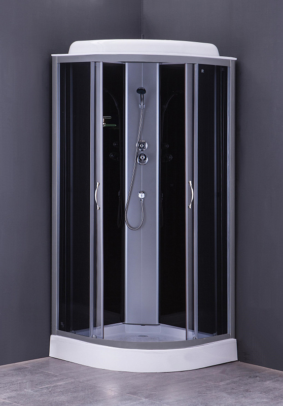 Душевая кабина 900×900×2150 мм — идеальное решение для современного санузла с угловым монтажом. Конструкция оснащена двумя раздвижными дверями из прозрачного закалённого стекла толщиной 4 мм, обеспечивающими удобный доступ и визуальную лёгкость. Низкий поддон высотой всего 13 см выполнен из прочного ABS-пластика, что гарантирует долговечность и простоту ухода. Задние стенки изготовлены из стильного чёрного стекла, создающего эффектный контраст и добавляющего интерьеру элегантности. Алюминиевый профиль серого цвета придаёт конструкции дополнительную прочность и современный внешний вид. В комплект входит верхний душ и смеситель с ручным душем, обеспечивающие комфорт и разнообразие вариантов водных процедур. Эта душевая кабина сочетает в себе функциональность, стиль и качество, идеально подходя для компактных и просторных ванных комнат.