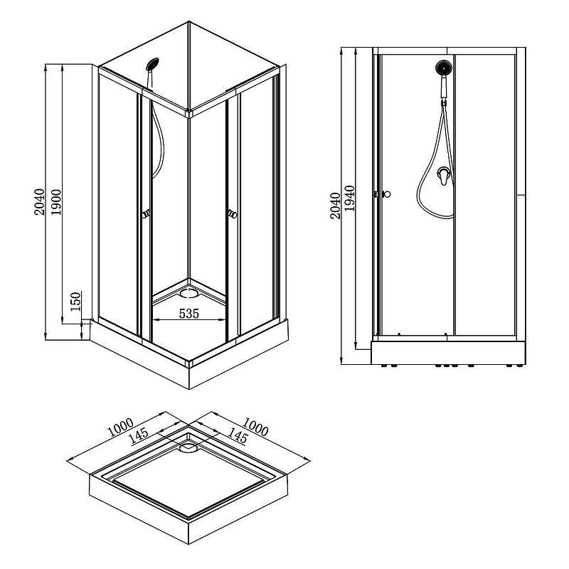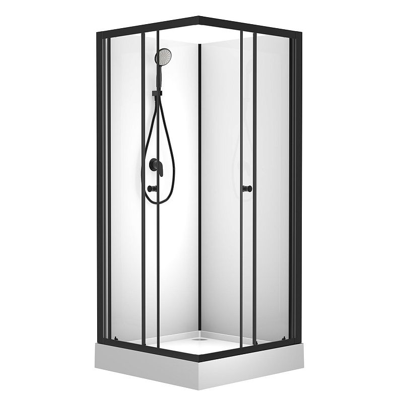 CS-21801-100 Душевая кабина  100x100x(190+15)см c низким поддоном 15см, прозрачное закаленное стекло 5 мм, задние стеклянные стенки БЕЛЫЕ, профиль черный-мат., черный  ручной душ + шланг для душа + черный держатель (3 места)
