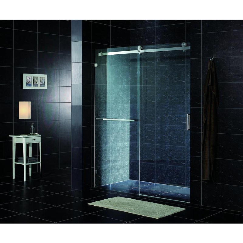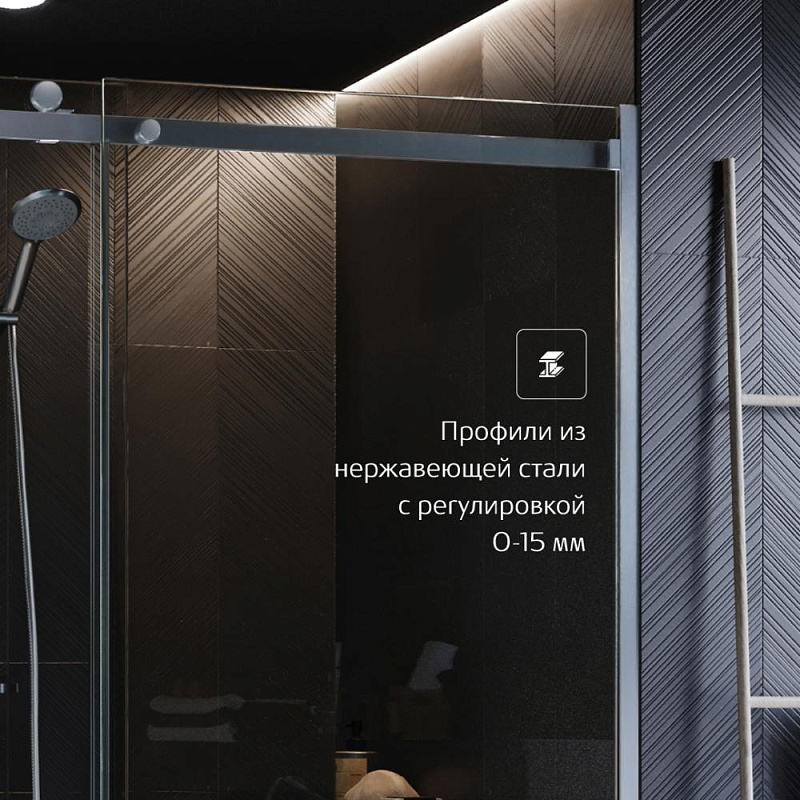 Прозрачное закаленное стекло толщиной 8 мм с гидрофобным покрытием MaxiClean. Профили из нержавеющей стали с регулировкой до 15 мм, металлические хромированные ручки. Раздвижные двери с системой плавного закрывания. Возможен монтаж без душевого поддона.