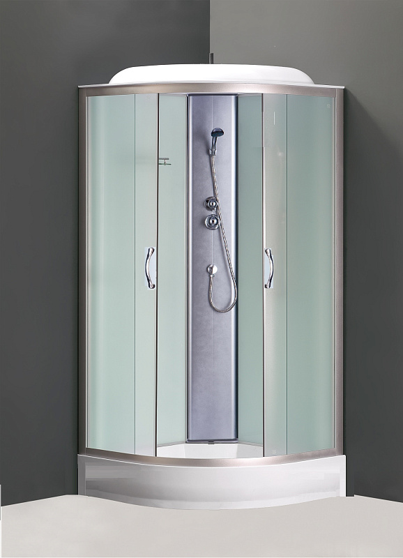 Душевая кабина размером 1000×1000×2150 мм с угловым монтажом — идеальное решение для компактной и стильной ванной комнаты. Конструкция оснащена двумя раздвижными дверями из матового закалённого стекла толщиной 4 мм, обеспечивающими удобный доступ и приватность. Низкий поддон высотой всего 13 см выполнен из прочного ABS-пластика, что гарантирует долговечность и лёгкость в уходе. Задние стенки изготовлены из белого стекла, придающего кабинке современный и аккуратный вид. Алюминиевый профиль с матовым хромовым покрытием добавляет элегантности и устойчивости конструкции. В комплект входит верхний душ и смеситель с ручным душем, обеспечивающие комфортное и разнообразное принятие водных процедур. Эта душевая кабина сочетает в себе функциональность, качество и современный дизайн.