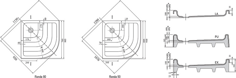 Возможна установка на ножки или в пол (тип LA), облицовка керамической плиткой (тип EX) или самонесущие поддоны, укрепленные полиуретановым носителем, в этом случае панель и поддон образуют одно целое (тип PU), а носитель обеспечивает легкую установку поддона.