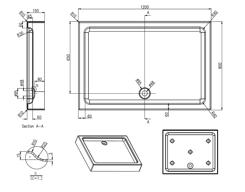 Поддон душевой, прямоугольный, акриловый (3,5-4 мм толщ.), каркас с ножками, сифон