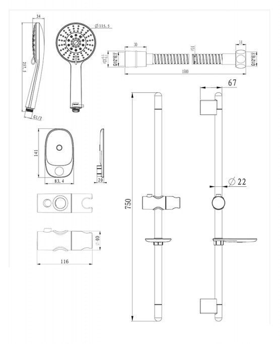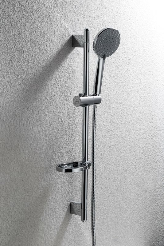 душевой комплект: штанга 22*750 мм, шланг 1,5 м ПВХ, лейка 3 режима диаметр 115,5 мм, мыльница хромированный ABS-пластик