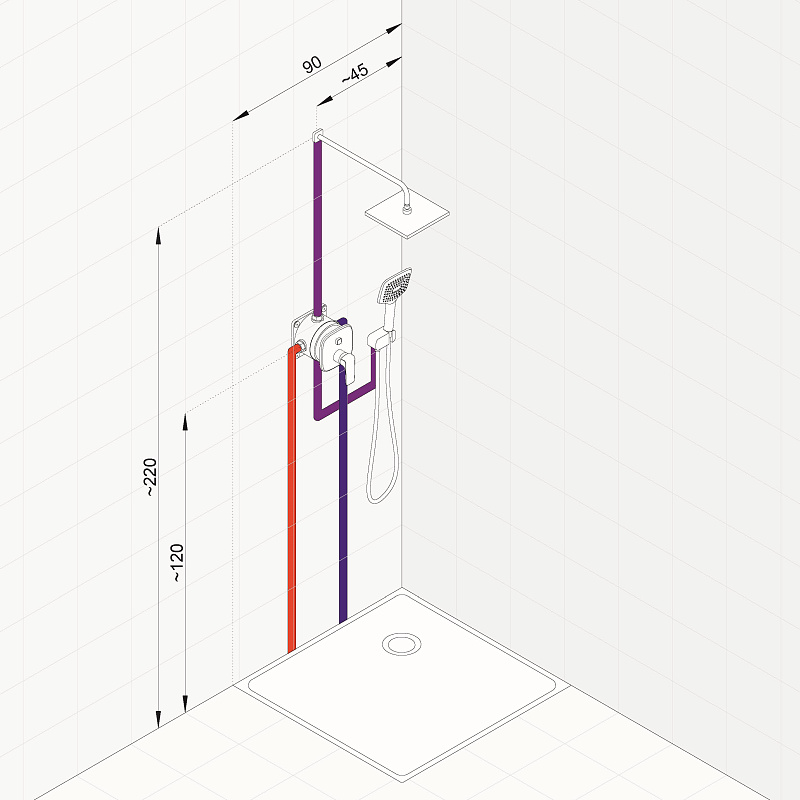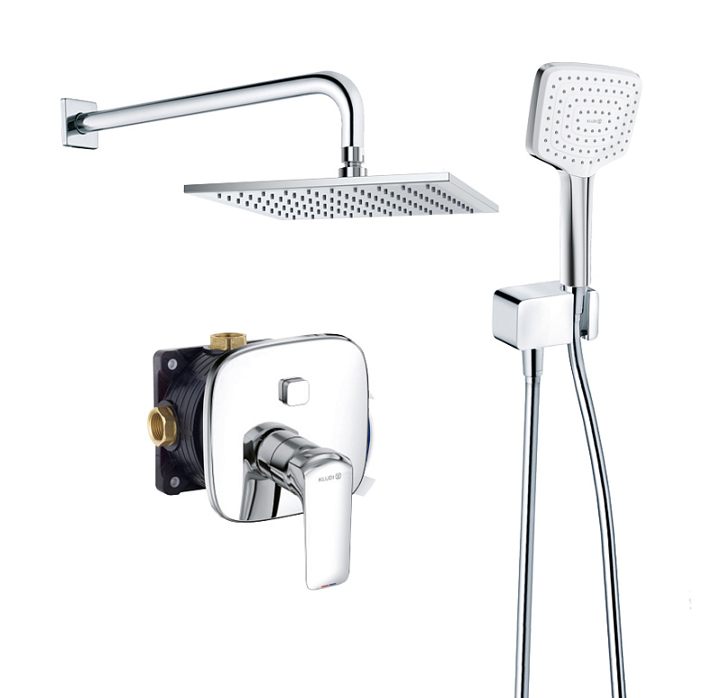 Верхний душ, Держатель для душа, Душевая лейка, Душевой шланг, Комплект креплений, Кронштейн для верхнего душа, Скрытая монтажная часть, Смеситель, Шланговое подключение