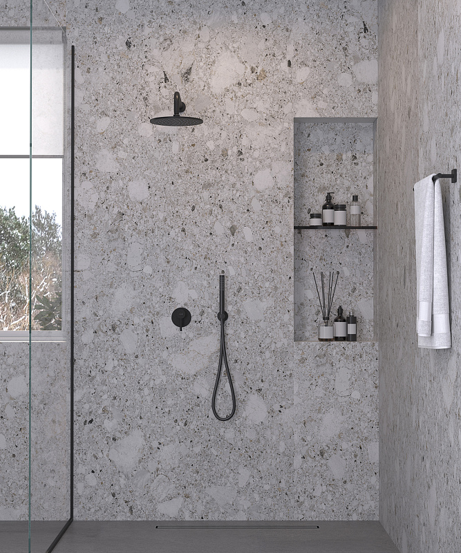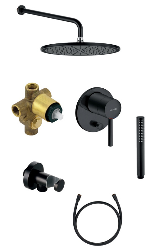 Верхний душ, Держатель для душа, Душевая лейка, Душевой шланг, Комплект креплений, Кронштейн для верхнего душа, Скрытая монтажная часть, Смеситель, Шланговое подключение