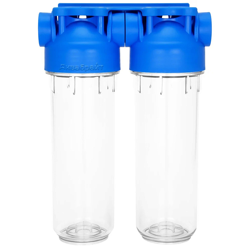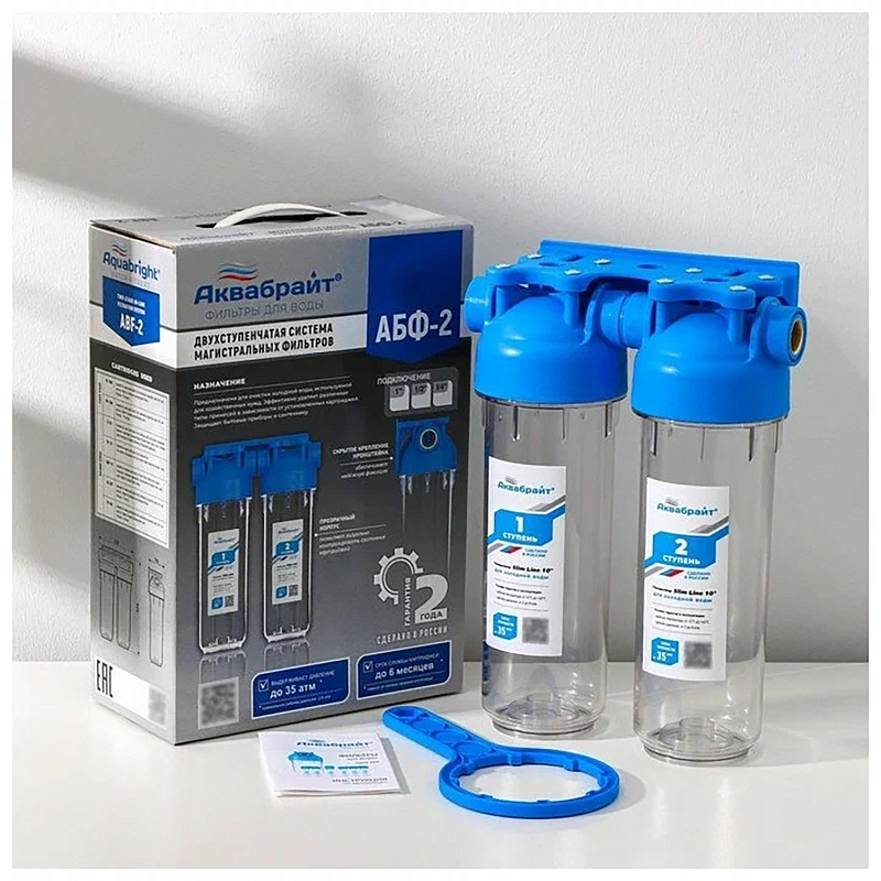Фильтр для воды АКВАБРАЙТ магистральный, 3/4 ", 2-х ступенчатый, прозрачные корпуса, Slim Line 10, в комплекте кронштейн и ключ (АБФ-2 3/4)