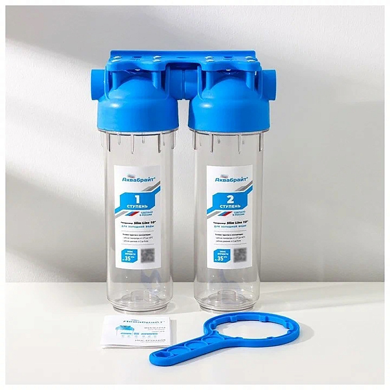 —Фильтр для воды АКВАБРАЙТ магистральный, 3/4 ", 2-х ступенчатый, прозрачные корпуса, Slim Line 10, в комплекте кронштейн и ключ (АБФ-2 3/4)