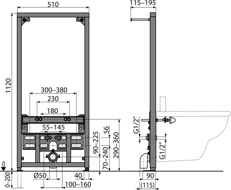 Для подвесного биде с интервалом крепления 180 мм или 230 мм
