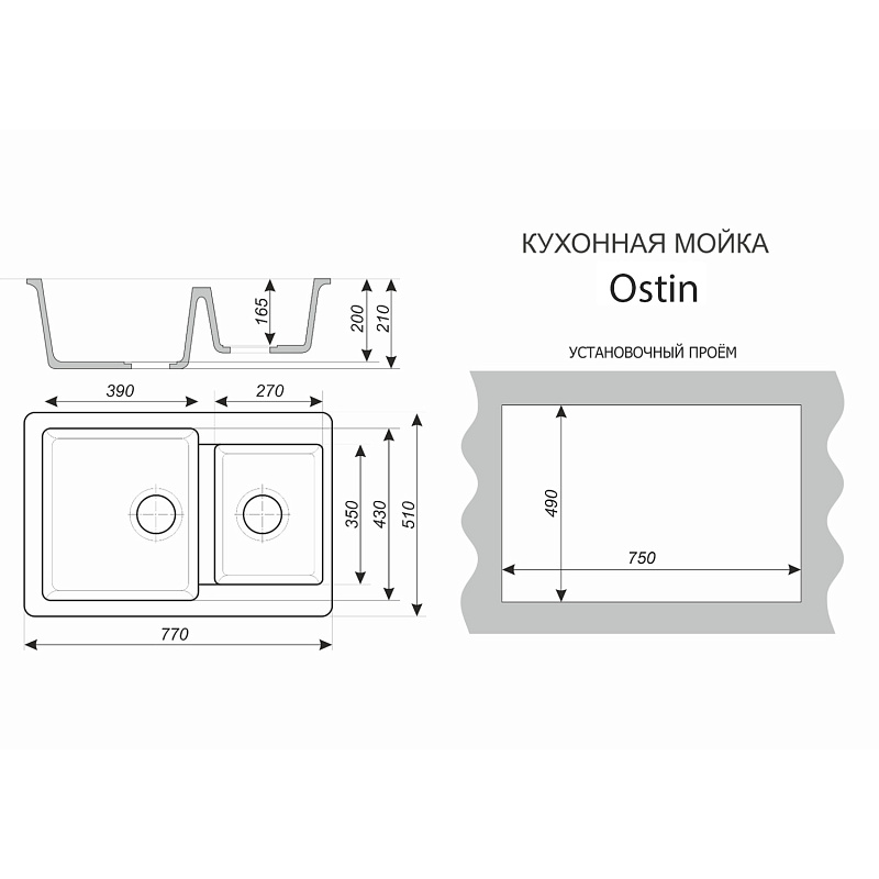 —Кухонная мойка AZARIO Ostin 770x510х210 искусственный мрамор, двойная, сифон в комплекте, цвет черный (CS00105244)