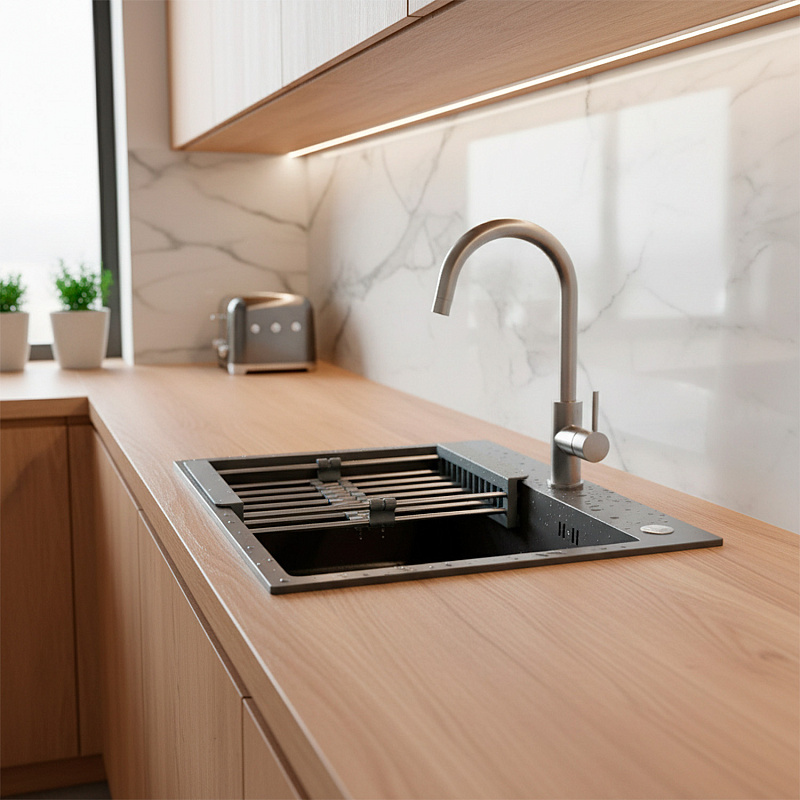 —Кухонная мойка AZARIO NICOLE 500х500х220 нержавеющая сталь, в комплекте сифон, диспенсер, коландер, серая соты (AZG5050H)