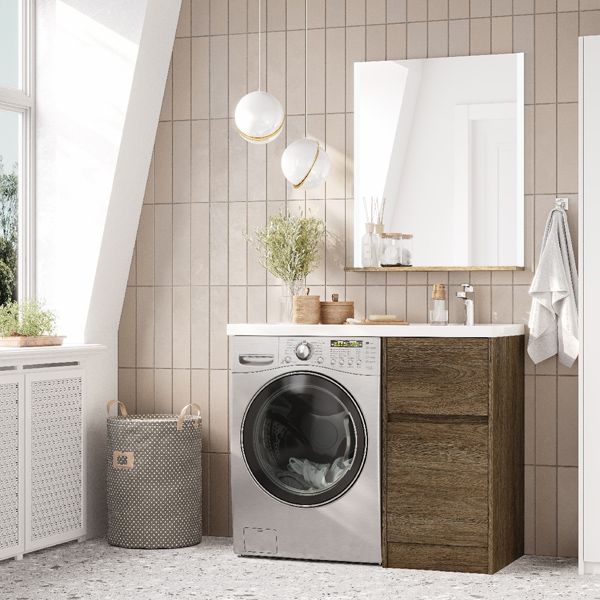Тумба Лондри под стиральную машину выполнена из влагостойкой ламинированной плиты в древесной отделке. Тумбы комплектуются фасадами как с такой же древесной текстурой, так и в универсальном белом глянцевом цвете – это позволяет выбрать модель тумбы в соответствии с личными предпочтениями, создав наиболее удачное решение для конкретного интерьера ванной комнаты. Более того, при желании в одной тумбе можно совместить корпус и фасады в двух разных по оттенку древесных декорах. Верхний ящик открывается с помощью системы push-to-open, а нижний - за фасад с помощью удобного выпила под углом. Тумба установлена на регулируемые опоры, которые находятся за цоколем. Тумба комплектуется раковиной Лондри 105 из прочного литого мрамора (Приобретается отдельно!). Широкое крыло раковины обеспечивает ванную комнату дополнительным функциональным пространством. Дополнительно к тумбе можно приобрести шкаф-колонну Лондри и зеркальный шкаф Лондри 100.