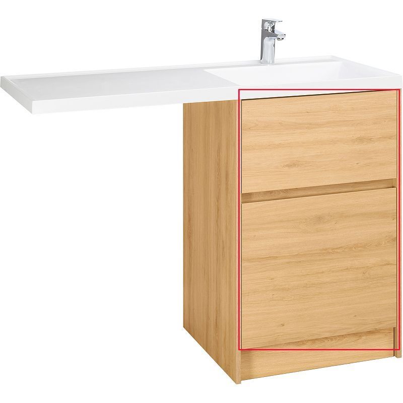 Фасад для тумбы Лондри под стиральную машину выполнен из влагостойкой ламинированной плиты в древесной отделке цвета Дуб Сантана. Корпус тумбы и фасад приобретаются отдельно. Верхний ящик открывается с помощью системы push-to-open, а нижний - за фасад с помощью удобного выпила под углом. Ящики выдерживают нагрузку до 25 кг. Тумба установлена на регулируемые опоры, которые находятся за цоколем. Тумба комплектуется раковиной Лондри 120 из прочного литого мрамора, который устойчив к воздействию химических средств. Широкое крыло раковины обеспечивает ванную комнату дополнительным функциональным пространством. Дополнительно к тумбе можно приобрести шкаф-колонну Лондри и зеркальный шкаф Лондри 120.