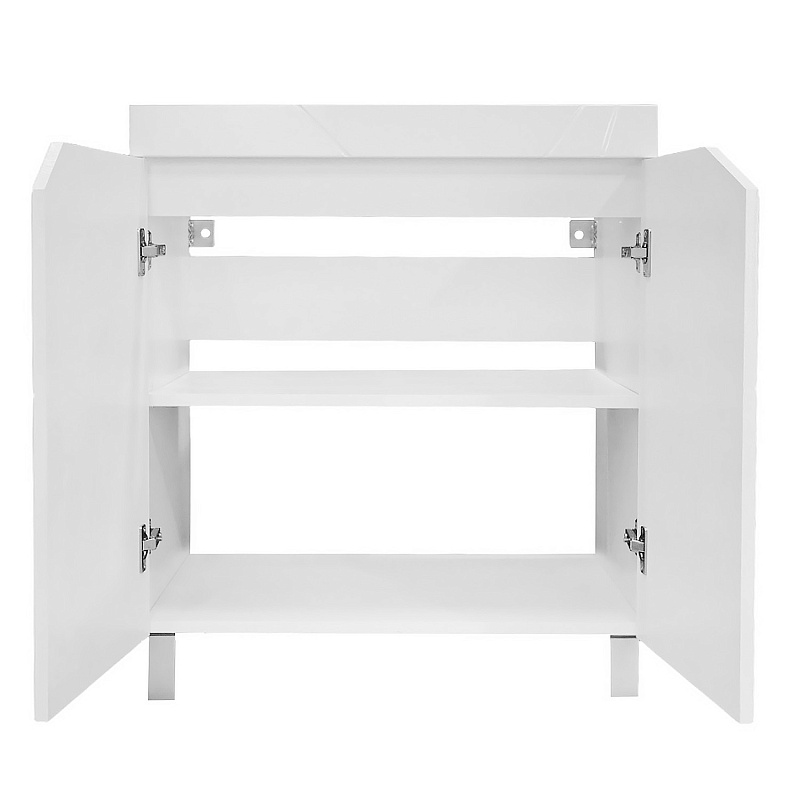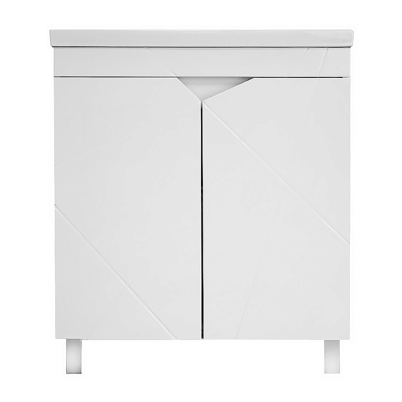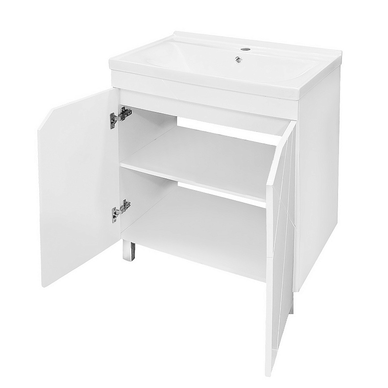 Модели одного комплекта (набора) мебели Оптимум выполнены в едином архитектурно-художественном и конструктивно-технологическом решении. Фасады имеют геометрическую фрезеровку с встроенной ручкой. Классический конструктив тумб под раковину с двумя дверцами и полкой позволяет удобно разместить бытовую химию, косметические средства и все необходимое.