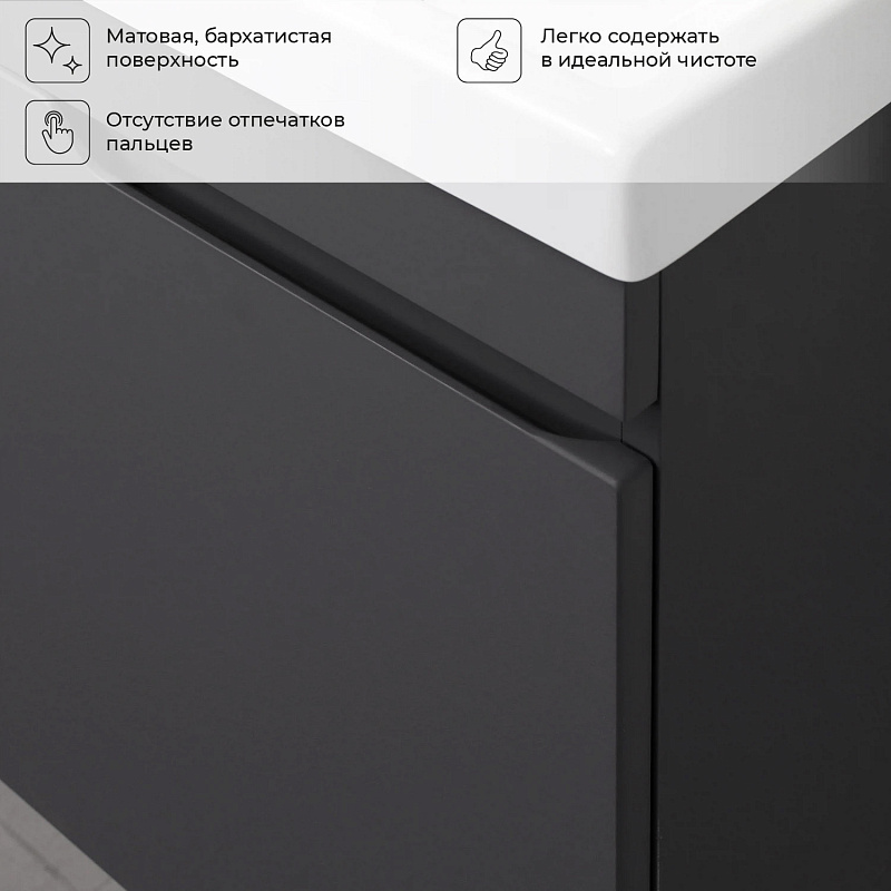 Подвесная тумба из коллекции Sky -это сочетание современной стилистики и богатого функционала. Подвесной способ установки дает возможность не только визуально увеличить пространство, но и обеспечивает быстрый и удобный доступ для уборки. Тумба покрыта ПВХ-пленкой графитового цвета, что обеспечивает изделию привлекательный внешний вид, а также износостойкость и долговечность. Качественные направляющие скрытого монтажа обеспечивают плавное открывание и закрывание ящичков. Ручки интегрированы в фасад, что исключает возможность случайного удара о фурнитуру.