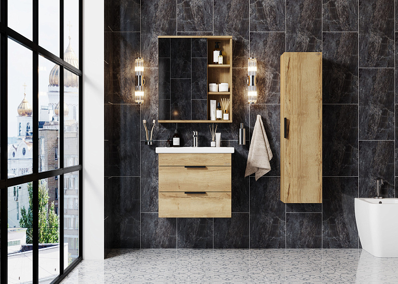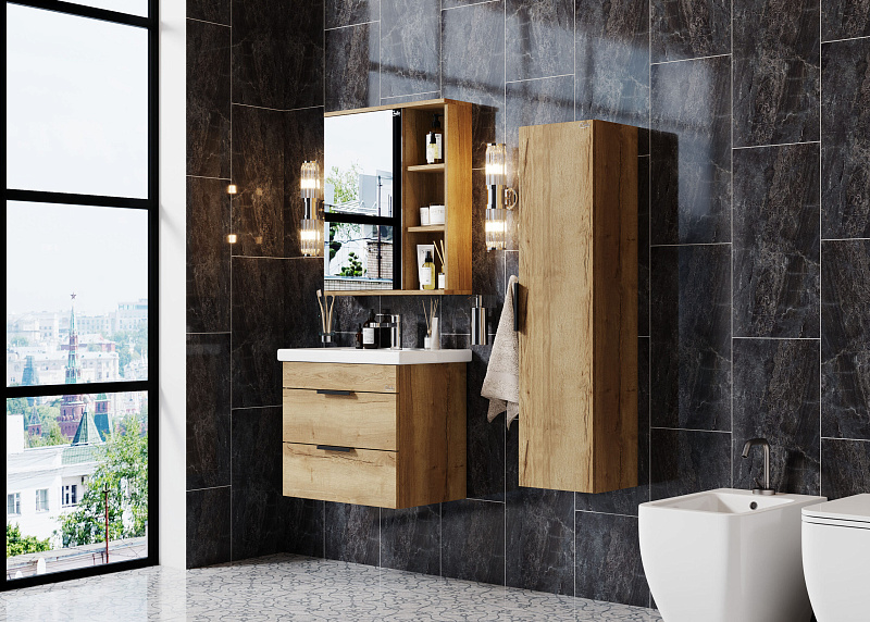 Подвесной пенал Onika ЛЕГРАН 30.10 - это сочетание насыщенного древесного декора и благородства металла: роскошная текстура и натуральный цвет дуба дают теплоту, а матовая металлическая ручка добавляет урбанизма и солидности.