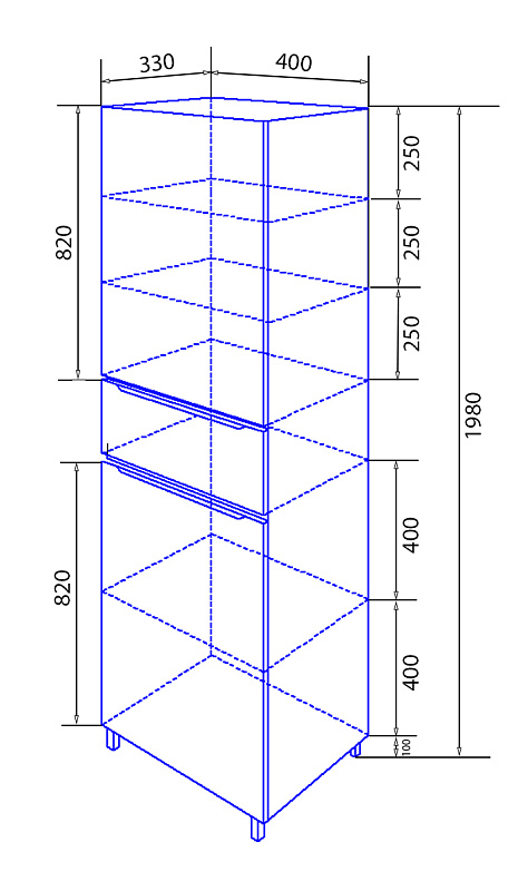 Пенал в собранном виде, с двумя распашными фасадами и одним выдвижным ящиком. Распашные фасады на доводчиках, выдвижной ящик комплектуется направляющими скрытого монтажа с доводчиками. В верхнем распашном фасаде имеется 2 стеклянные полочки, в нижнем - одна полочка из ЛДСП.
