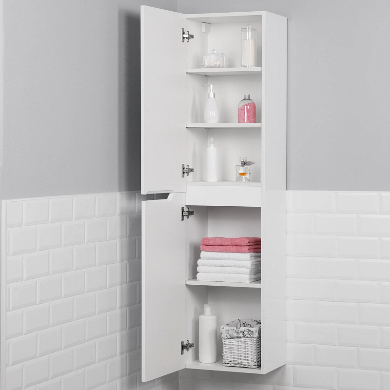 Подвесной пенал из коллекции Sky – универсальное решение для современной ванной. Мебель в стиле минимализм хорошо сочетается с интерьером, не загромождая его. Несмотря на свои скромные габариты пенал позволяет аккуратно хранить массу вещей, поддерживая идеальный порядок в ванной. У этой модели простая и удобная система хранения – два распашных шкафчика, разделенных полками. Дверцы шкафов оснащены системами плавного закрывания и удобными интегрированными ручками. Подвесной способ установки облегчает уборку ванной комнаты. Дополнить комплект можно изделиями из коллекции Sky.