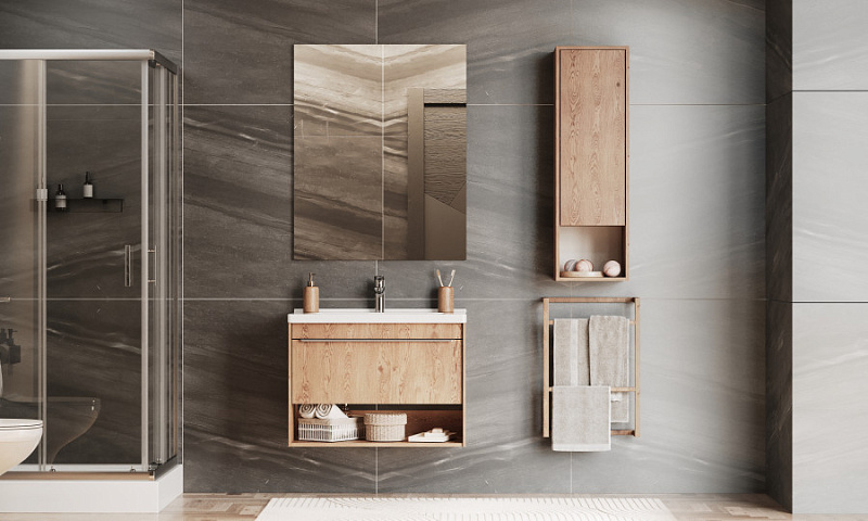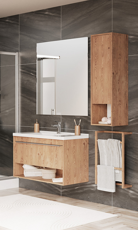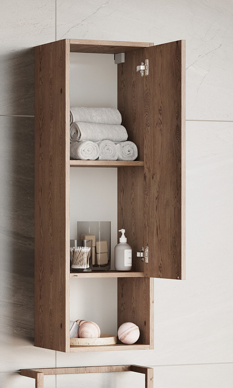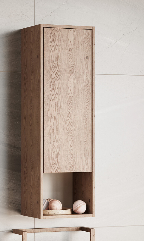 Шкафы для ванной комнаты коллекции Хоуп — это идеальное сочетание простоты линий и функциональности, которое преобразит ваше пространство. Элегантные линии и современный дизайн подчеркивают утонченность интерьера, а использование влагостойкой ЛДСП гарантирует долговечность и простоту в уходе. Корпус и фасад выполнены из влагостойкой ЛДСП в текстурированном древесном декоре. Навесные шкафы открываются простым нажатием (push-to-open). За фасадом-створкой скрываются регулируемые полочки в цвет корпуса из влагостойкой ЛДСП. Они крепятся на надежные полкодержатели, которые защищают от опрокидывания. Регулируемые петли позволят использовать весь функционал тумбы бесшумно и с комфортом, а открытая ниша дает возможность убирать туда необходимы принадлежности, чтобы они всегда были под рукой.
