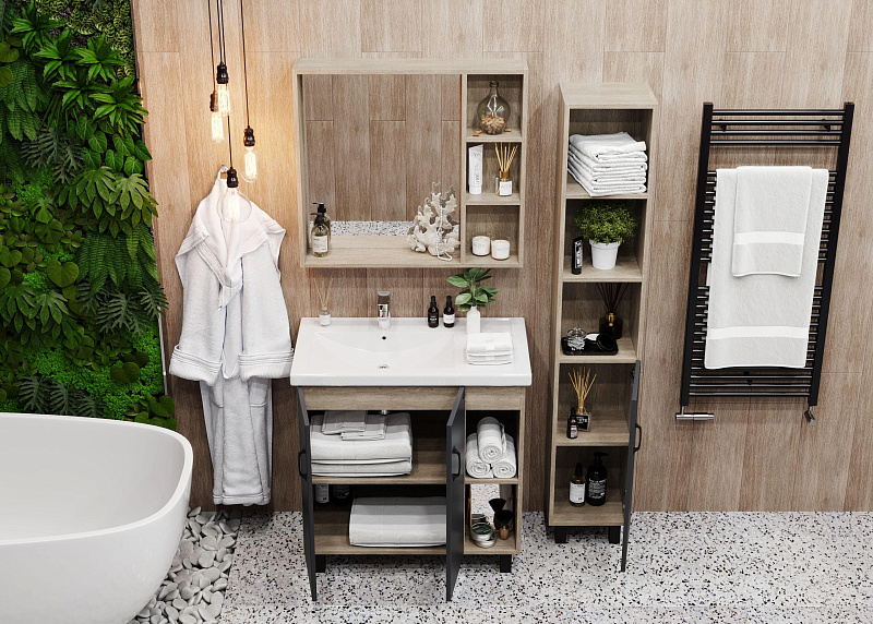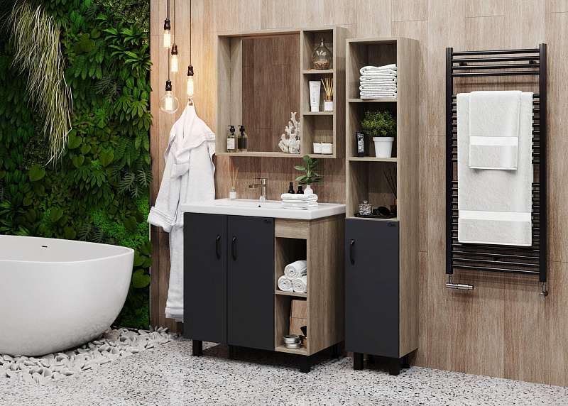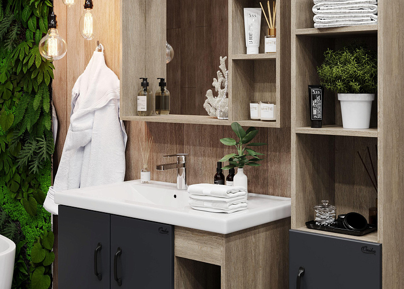 В тумбе Onika ТИМБЕР 80.01 удачно сочетаются контрастные цвета и фактуры: серый матовый фасад с покрытием SoftTouch, корпус цвета дуба с роскошной текстурой, черная матовая металлическая фурнитура.