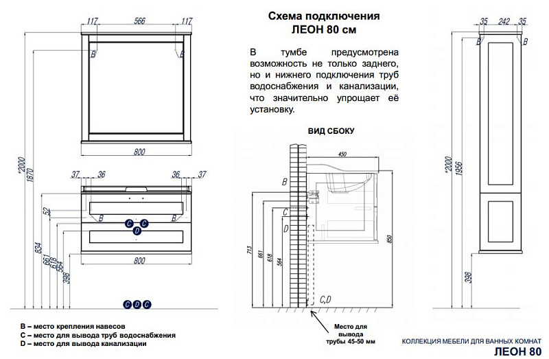 В тумбе установлены 2 ящика, и помимо стандартного подключения водоснабжения и канализации (из стены) предусмотрена возможность подключения труб снизу.
