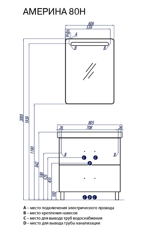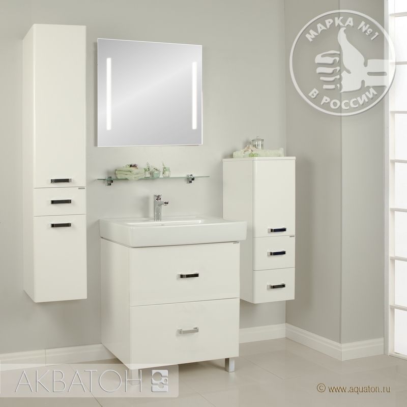 АМЕРИНА Н - модель из коллекции АМЕРИНА, предусматривающая установку на ножки и имеет 2 внешних ящика, а за верхним скрывается еще один скрытый встроенный ящик. Тумба комплектуется удобной прямоугольной керамической раковиной.