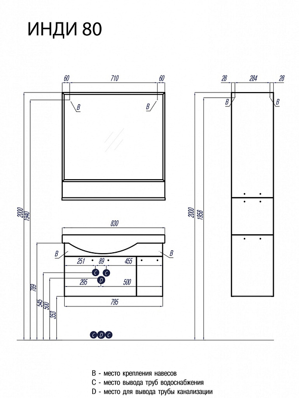 На данной модели тумбы-умывальника дополнительно предусмотрено нижнее подключение труб водоснабжения и канализации.