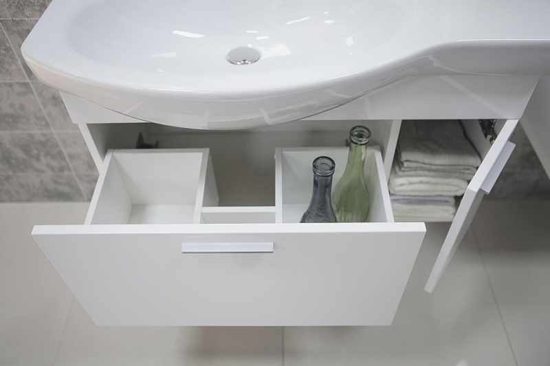 Тумба комплектуется керамической раковиной с большой удобной чашей. Боковая поверхность справа от чаши позволит разместить предметы, которые всегда должны быть под рукой. Тумба очень вместительна и функциональна. Глубина ящиков без труда позволяет размещать высокие бутылочки и баночки, а встроенный механизм плавного закрывания обеспечивает мягкий и бесшумный ход ящика. За створкой фасада - дополнительное место хранение.