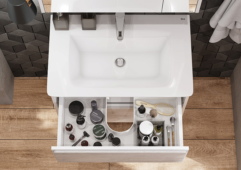 Тумба для раковины Ronda в современном стиле от испанского бренда Roca, выполненная из высококачественной МДФ, с ящиками полного выдвижения с системой push-to-open.