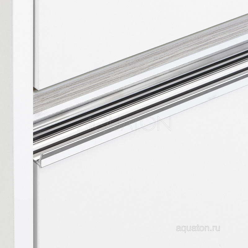 Верхний ящик открывается с помощью системы push-to-open, а нижний – за изящную удобную профильную хромированную ручку. Над ручкой установлена вставка из влагостойкой ламинированной плиты благородного цвета дуб наварра.