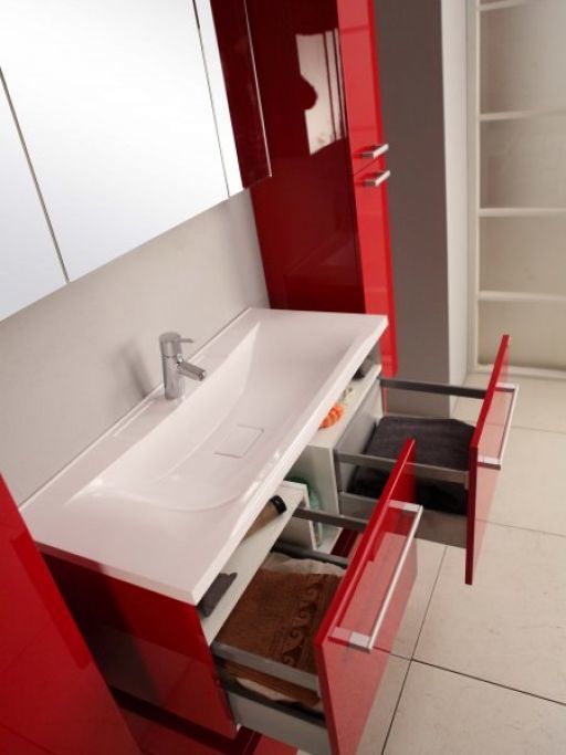 Тумба выпускается с выдвижным ящиком, который оснащен системой плавного закрывания и антискользящим ковриком.