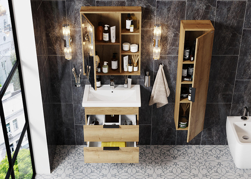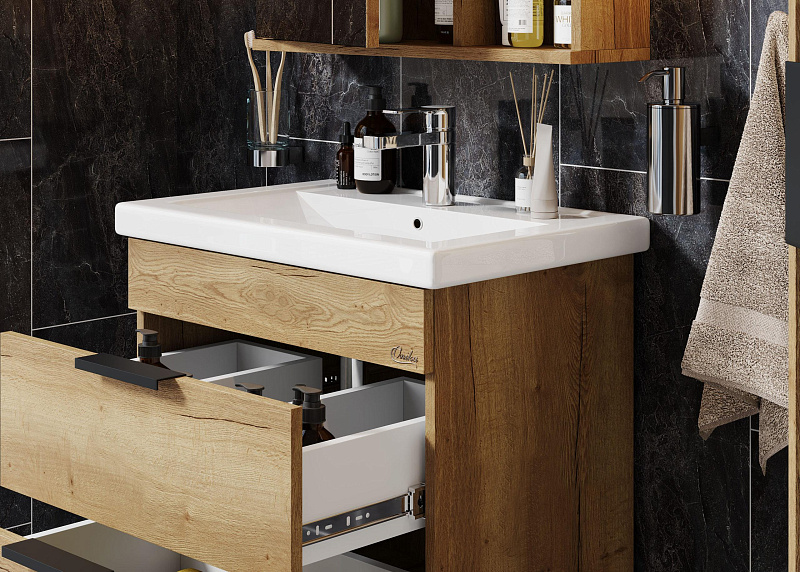 Подвесная тумба Onika ЛЕГРАН 70.13 - это сочетание насыщенного древесного декора и благородства металла: роскошная текстура и натуральный цвет дуба дают теплоту, а матовые металлические ручки добавляют урбанизма и солидности.