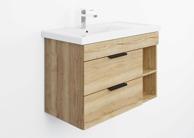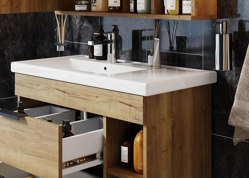 Подвесная тумба Onika ЛЕГРАН 80.13 - это сочетание насыщенного древесного декора и благородства металла: роскошная текстура и натуральный цвет дуба дают теплоту, а матовые металлические ручки добавляют урбанизма и солидности.
