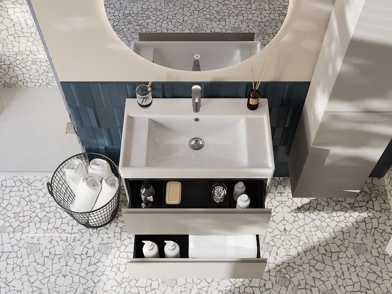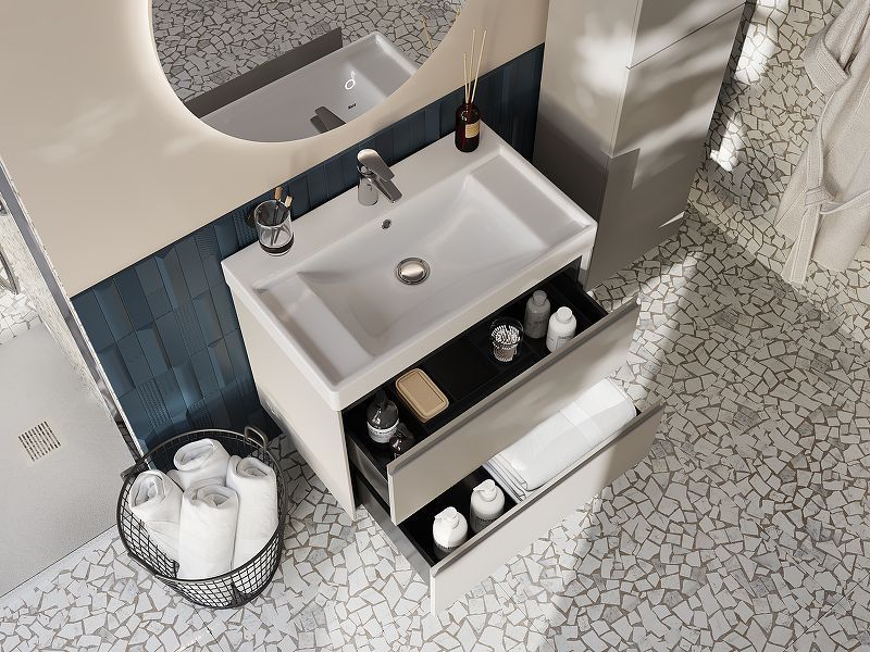 В обоих ящиках находятся противоскользящие коврики, а верхний ящик снабжен также встроенной организацией пространства – эстетика и идеальный порядок в ванной комнате.