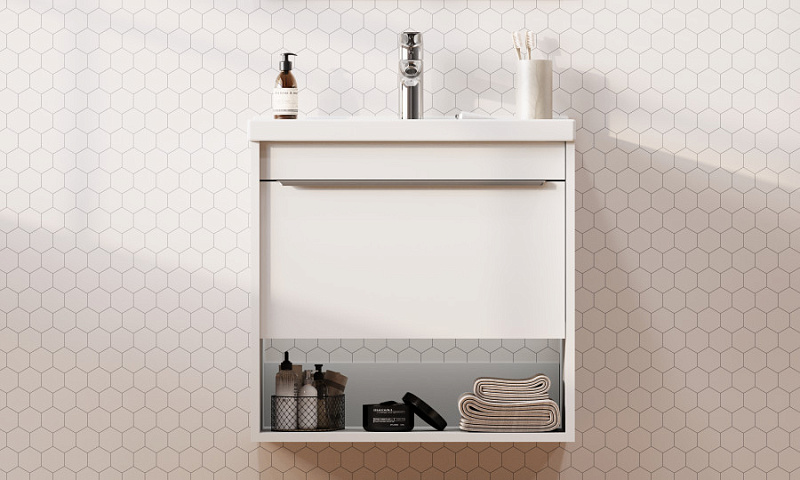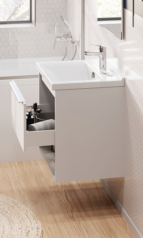 Тумбы для ванной комнаты коллекции Хоуп — это идеальное сочетание простоты линий и функциональности, которое преобразит ваше пространство. Элегантные линии и современный дизайн подчеркивают утонченность интерьера, а использование влагостойкой ЛДСП гарантирует долговечность и простоту в уходе. Удобная ручка добавляет нотку изысканности, а открытая ниша предоставляет возможность организовать пространство так, как вам удобно — будь то размещение любимых аксессуаров или необходимых принадлежностей. Корпус и фасад выполнены из влагостойкой ЛДСП в белой матовой покраске полиэфирной краской ультрафиолетового отверждения. Ручка изготовленная из алюминия, она не только привлекает внимание своим эстетичным дизайном, но и имеет надежный и удобный хват. Направляющие полного выдвижения скрытого монтажа с доводчиком позволят использовать весь функционал ящиков бесшумно и с комфортом, а открытая ниша дает возможность убирать туда необходимы принадлежности, чтобы они всегда были под рукой.