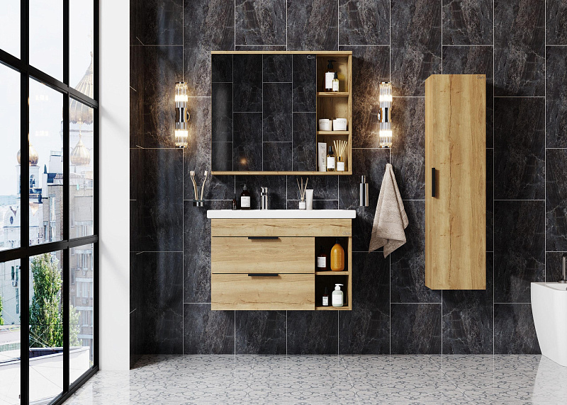 Зеркальный шкаф Onika ЛЕГРАН 80.00У - это сочетание насыщенного древесного декора и благородства металла: роскошная текстура и натуральный цвет дуба дают теплоту, а матовая металлическая ручка добавляет урбанизма и солидности.