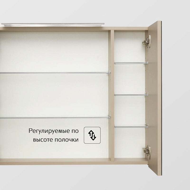 Зеркальный шкаф Oleta оснащен светильником от европейского бренда Ebir с возможностью регулировки положения, IP 44, 5 700 K. Теплота света у светильника 5 700 K - это яркий свет, идеальный для нанесения макияжа и бритья. Положение светильника можно регулировать: наклонить слегка вниз или направить свет повыше. За зеркальными фасадами расположены регулируемые по высоте полочки из просветленного стекла. Фасады оснащены петлями Hettich с плавным закрыванием.
