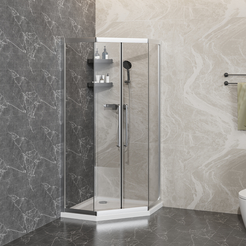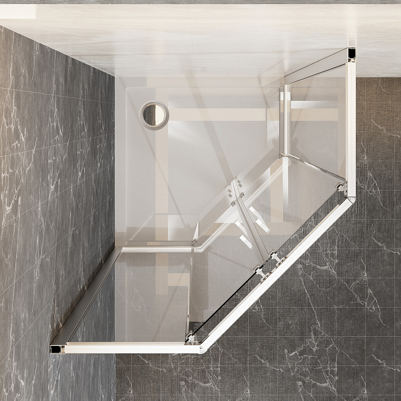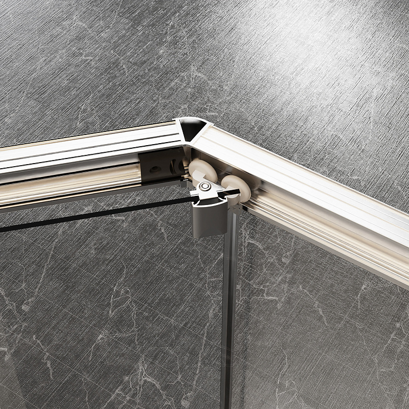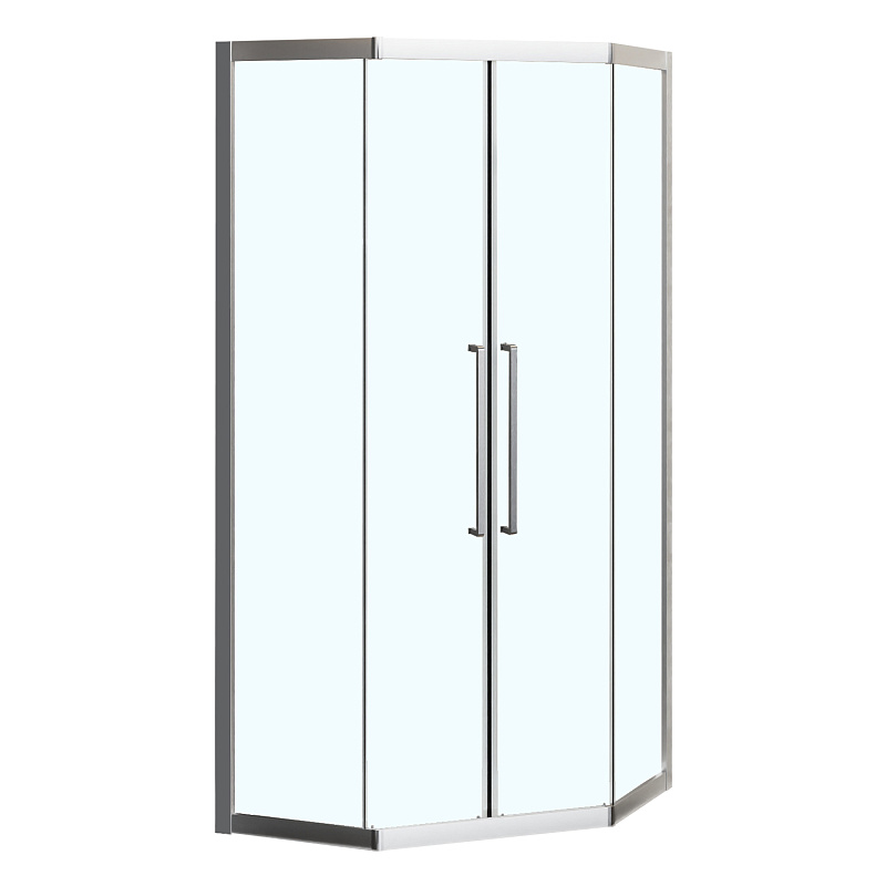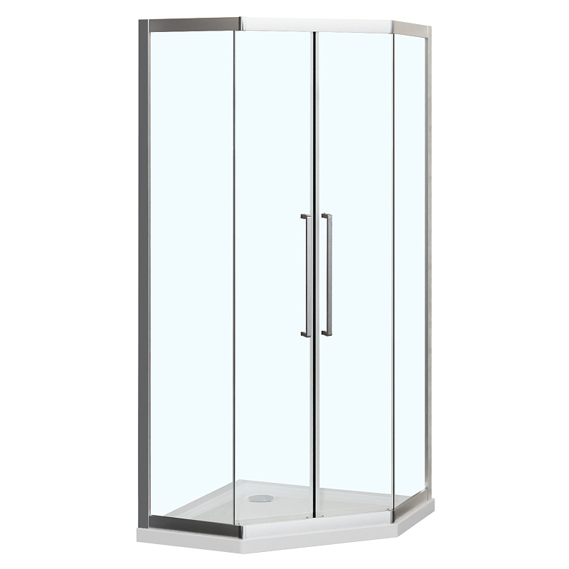 Пятиугольный душевой уголок, с двумя раздвижными дверьми, на усиленных двойных роликах с нержавеющими подшипниками.