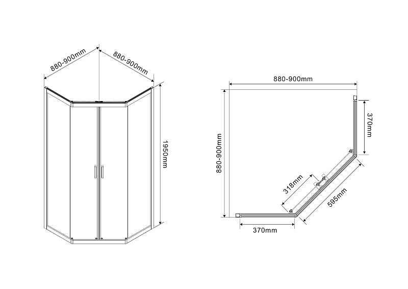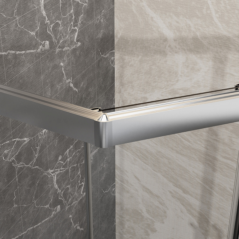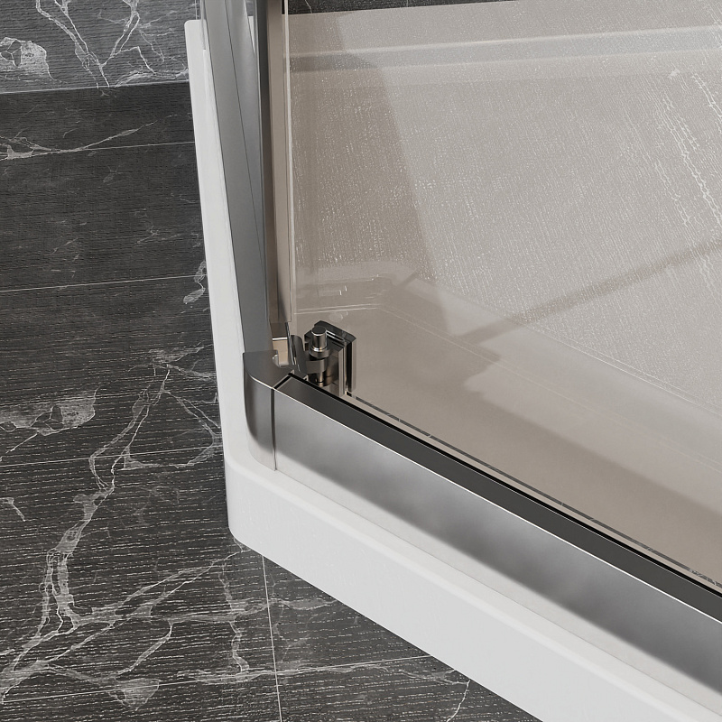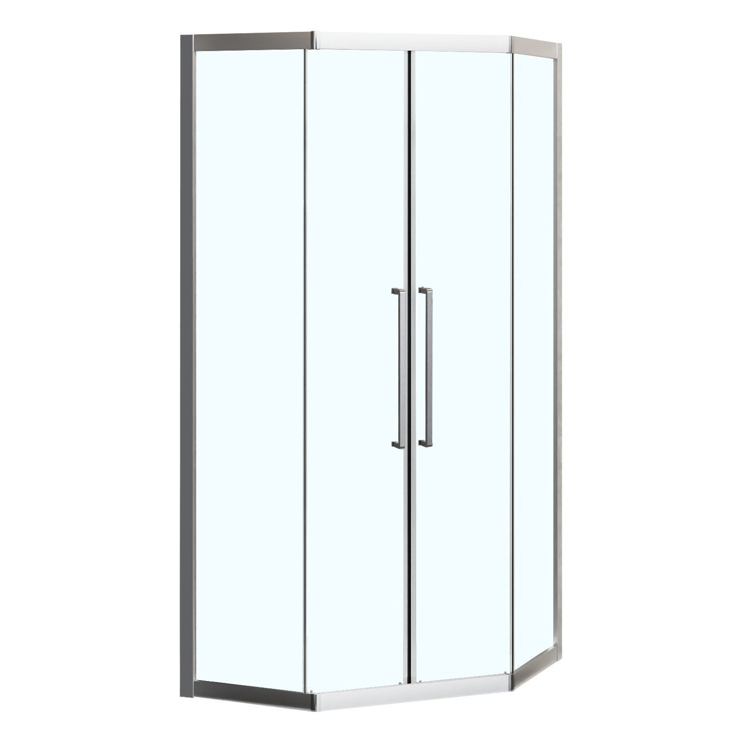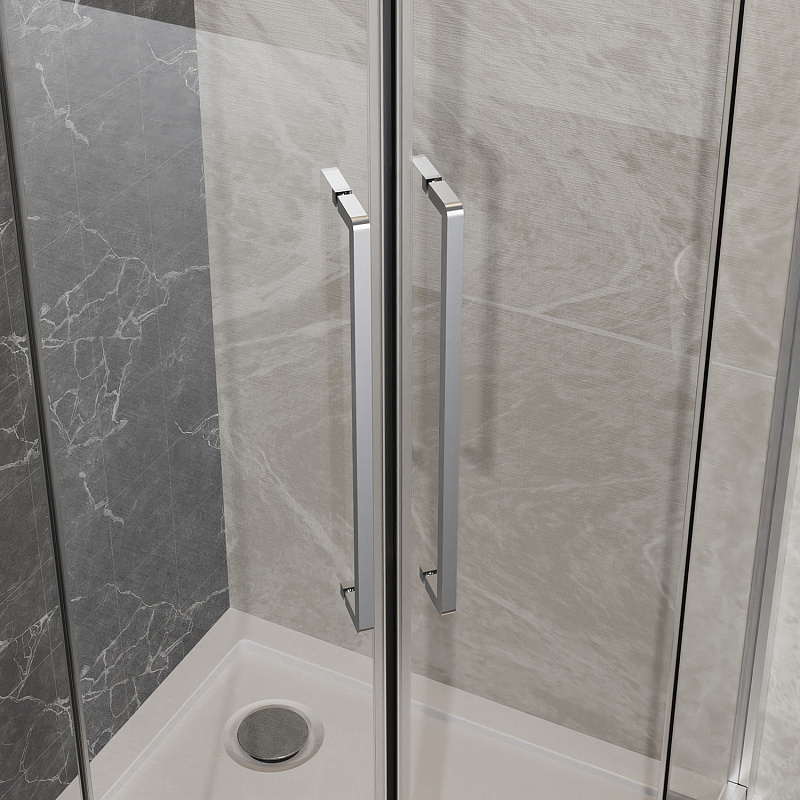 Пятиугольный душевой уголок, с двумя раздвижными дверьми, на усиленных двойных роликах с нержавеющими подшипниками.