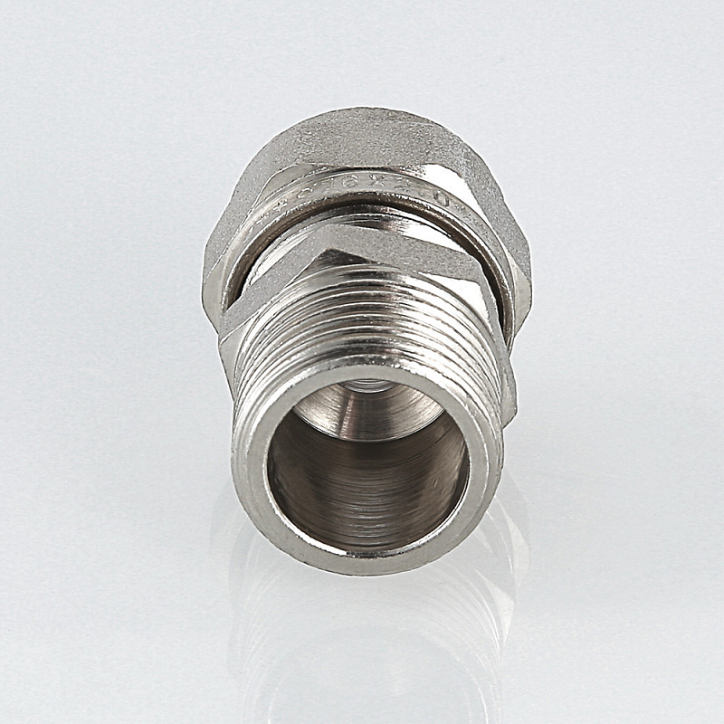 Прямой латунный никелированный фитинг для соединения металлополимерной трубы и компонента системы с резьбовым подключением. Резьба фитинга – наружная трубная по ГОСТу 6357.
