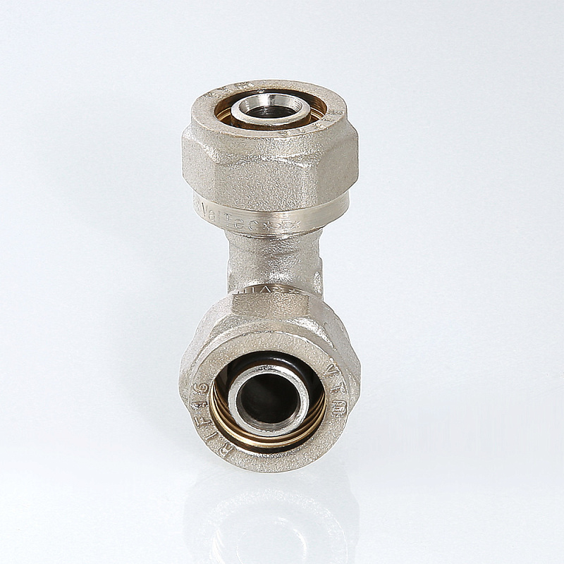Фитинг обжимной угольник для соединения двух металлополимерных (металлопластиковых) труб равного диаметра под углом 90° друг к другу.