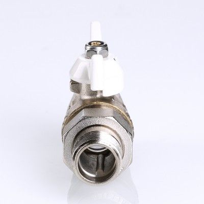 Прямой полнопроходной ремонтопригодный шаровой кран с увеличенным ресурсом. Соединен накидной гайкой с резьбовым полусгоном. Корпуса деталей – латунные, никелированные. Кран оснащен ручкой типа «бабочка» с утолщенной стенкой из алюминиевого сплава и эпоксидной покраской белого цвета. Резьба присоединений – внутренняя/наружная.