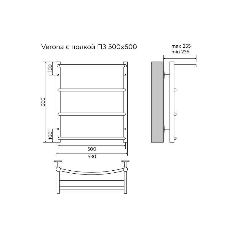 Полотенцесушитель водяной AZARIO VERONA 500/600 с полкой, 3 секции, нижнее/диагональное подключение, 1/2", хром (AZ04156P)