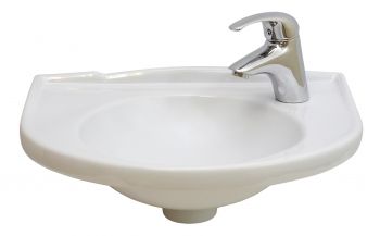 Умывальник Орфей 50 без пьедестала. Отверстие для смесителя справа. Крепление на кронштейнах. Раковина имеет водопоглощение менее 0,5%, покрыто химически и термически стойкой глазурью.