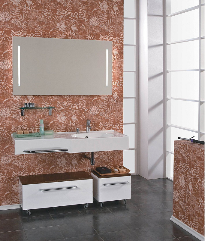 Раковина шириной 127 см, в которую встроен дозатор для жидкого мыла. Ее основные характеристики: большая и глубокая чаша, крыло, на котором можно разложить полезные мелочи, а также декоративный хромированный рейлинг, который можно использовать в качестве полотенцедержателя.