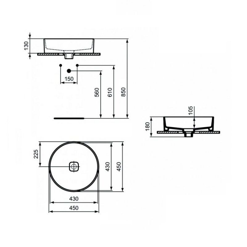 STRADA II Round Vessel Умывальник 45 см без отверстия под смеситель, для монтажа с мебелью, с отверстием перелива (щелевого типа), с керамической накладкой слива (T854601), с крепежом D570967