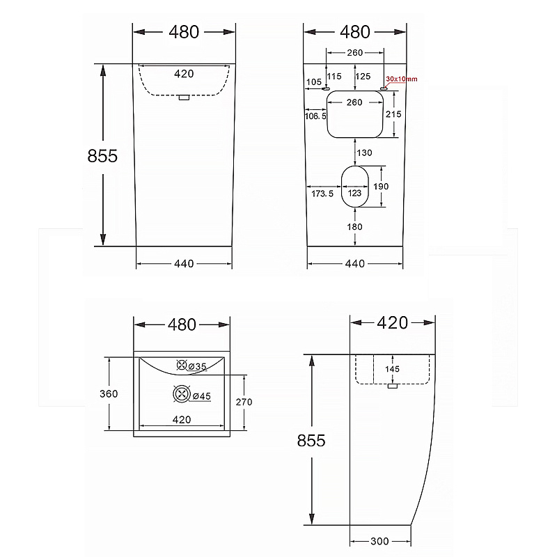 Раковина напольная Azario Комелла 480х420х855 отдельностоящая, прямоугольная, белый глянцевый (AZ-314)