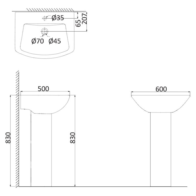 Раковина Creo Ceramique TOURS 600х500х830 с пьедесталом, белая (TO3000N+T03010N)