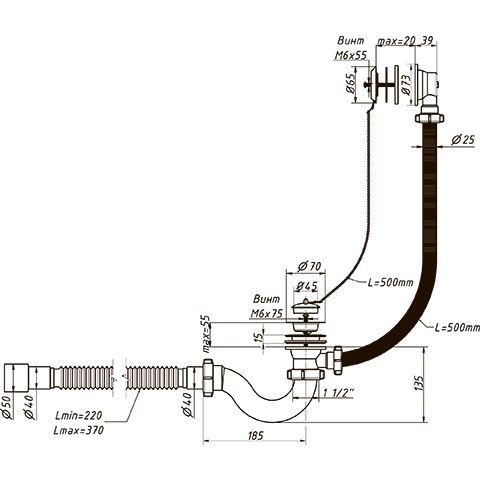 Слив-перелив для ванны ОРИО 1 1/2 х 40, с переливом и гибкой трубой 40-40/50 (А-40089)