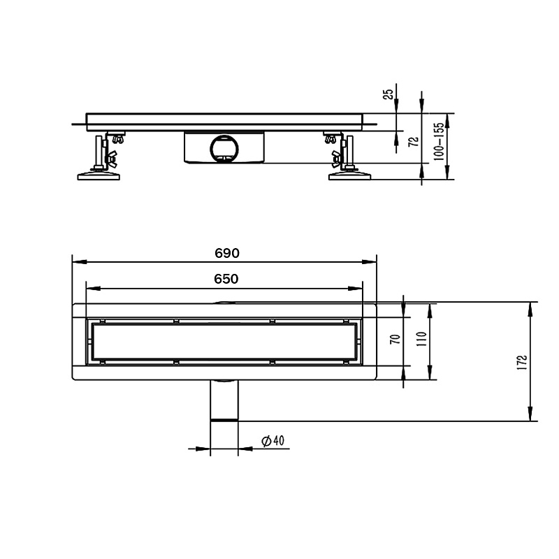 Желоб (лоток): сифон,  гидрозатвор, фильтр, решетка; регулируемые опоры  – 2 шт; гидроизоляционный материал; переходник 40/50