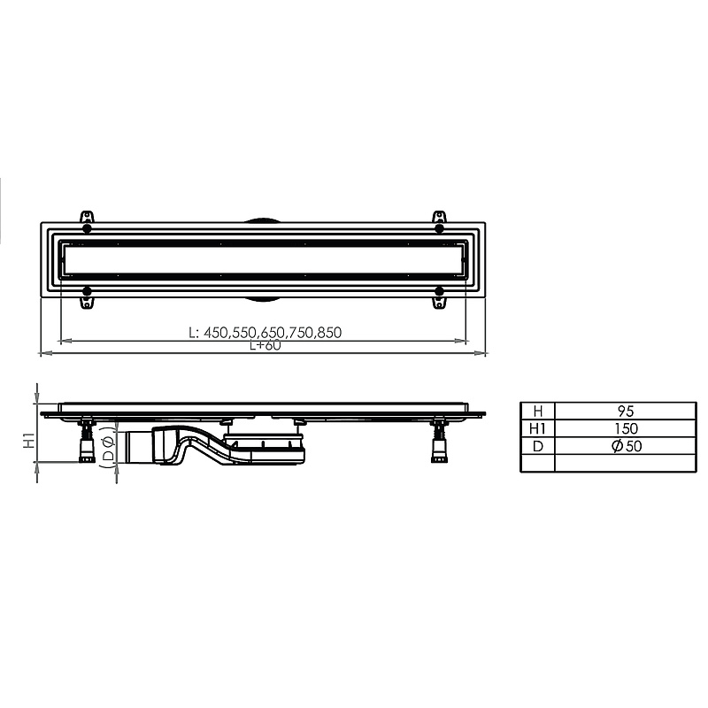 ПЛАСТИКОВЫЙ КОРПУС РЕШЕТКА ИЗ НЕРЖАВЕЮЩЕЙ СТАЛИ С ЛОТКОМ ПОД ПЛИТКУ(ДВУХСТОРОНЯЯ РЕШЕТКА), ПОВОРОТНЫЙ СИФОН 50 ММ С ПЛАСТИКОВЫМИ РЕГУЛИРУЮМЫМИ НОЖКАМИ